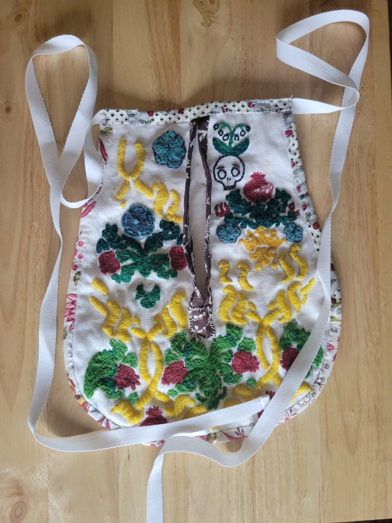 Luckily for me and my progress, my friend offered me a new hyperfixation: making pockets! I had known Melissa for over twenty years, having met in the Society for Creative Anachronism (SCA). She was receiving a long overdue and well-deserved award. I offered her anything, and she asked me to make her a tie-on pocket.