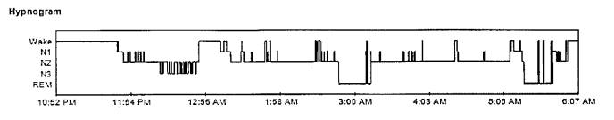 My hypnogram showed that, strictly speaking ,I have mild sleep apnea: about 6 an hour; 4 or less is normal. But I also have hypopnea, which is basically partial sleep apnea (apnea = completely stop breathing, hypopnea = partially stop breathing), and when you factor that in, it goes to the 40 times an hour figure, particularly in REM sleep. So it’s mild, but a lot.