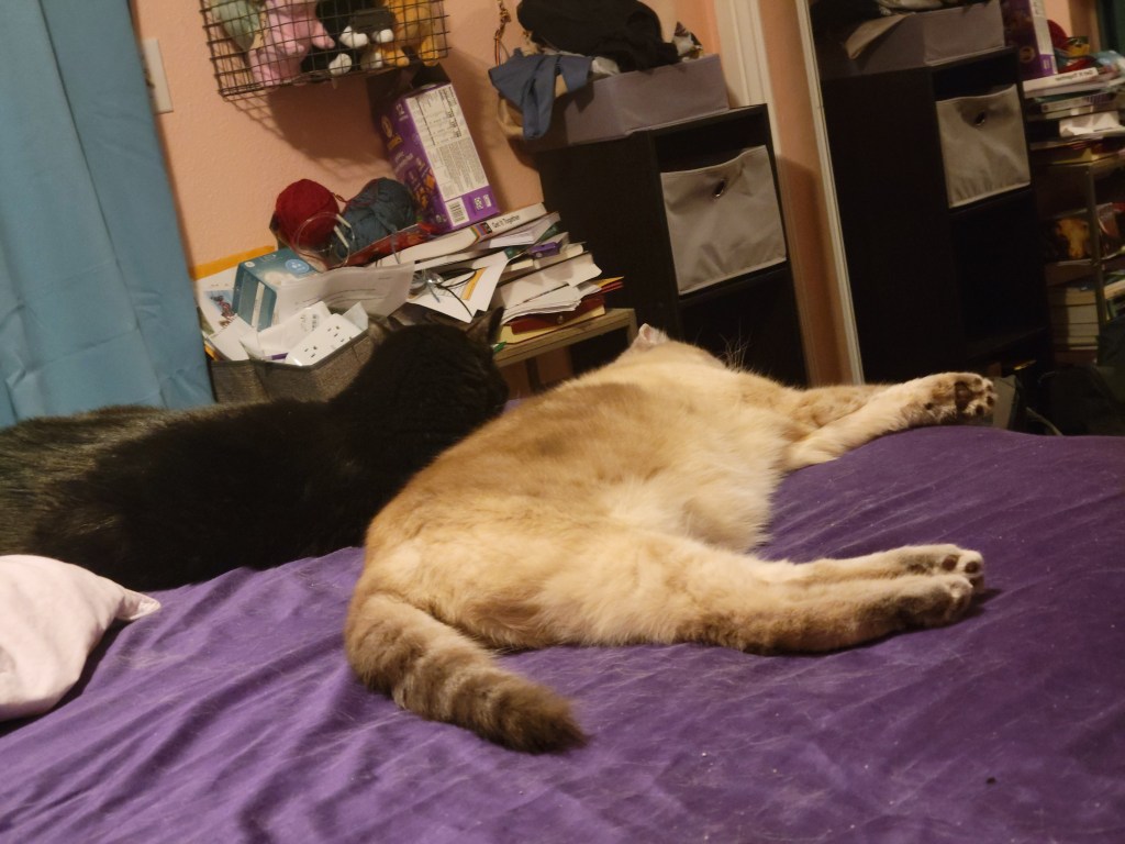 A decade later, I had let the cats back into the bedroom. In late 2023, as my mental health deteriorated and I started Making Plans, either Fluxx or Little Buddy was always by my side. I joked that they took shifts. They were definitely keeping an eye on me, even if their eyes were closed.